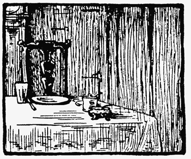 At the other end of the table was a partly unfolded tablecloth, a plate, a tumbler, a knife and fork, salt-cellar, mustard and a chair—in short, preparations for one person's supper.[Pg 34]