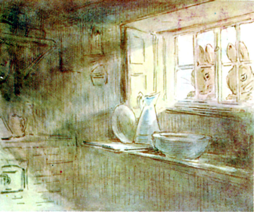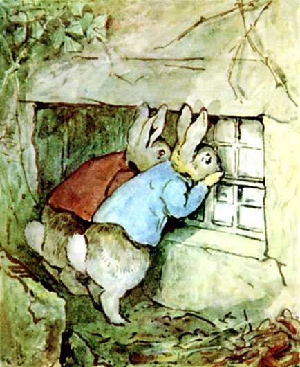 No person was to be seen, and no young rabbits. The kitchen was empty and silent; the clock had run down. Peter and Benjamin flattened their noses against the window, and stared into the dusk.