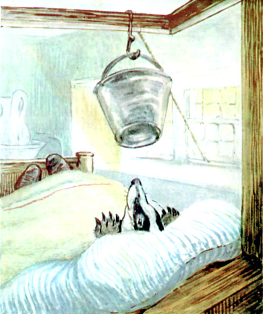 But no screams. Mr. Tod was mystified; he sat quite still, and listened attentively. Then he peeped in at the window. The water was dripping from the bed, the pail had rolled into a corner.