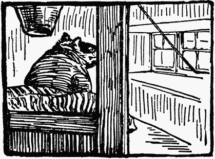 He peeped through the hinges of the half-open bedroom door. Then he turned and came out of the house in a hurry. His whiskers bristled and his coat-collar stood on end with rage.