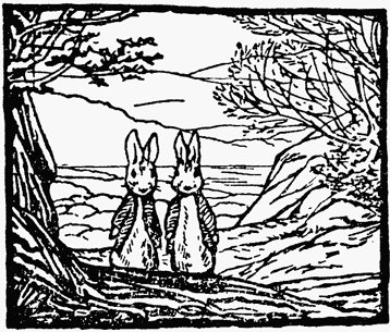 Benjamin Bunny came out of the dark tunnel, shaking the sand from his ears; he cleaned his face with his paws. Every minute the sun shone warmer on the top of the hill. In the valley there was a sea of white mist, with golden tops of trees showing through.[Pg 45]