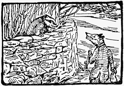 So old Mr. Bouncer laughed; and pressed Tommy Brock to come inside, to taste a slice of seed-cake and "a glass of my daughter Flopsy's cowslip wine." Tommy Brock squeezed himself into the rabbit hole with alacrity.[Pg 15]
