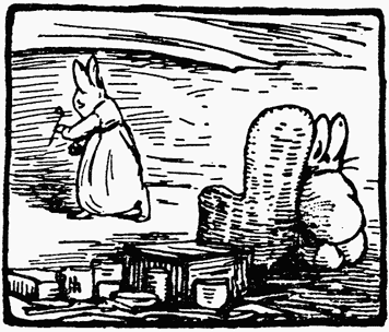 Old Mr. Bouncer, very sulky, was huddled up in a corner, barricaded with a chair. Flopsy had taken away his pipe and hidden the tobacco. She had been having a complete turn out and spring-cleaning, to relieve her feelings. She had just finished. Old Mr. Bouncer, behind his chair, was wondering anxiously what she would do next.