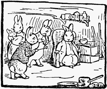 Great was old Mr. Bouncer's relief and Flopsy's joy when Peter and Benjamin arrived in triumph with the young family. The rabbit-babies were rather tumbled and very hungry; they were fed and put to bed. They soon recovered.