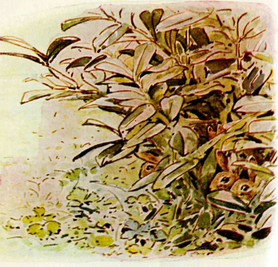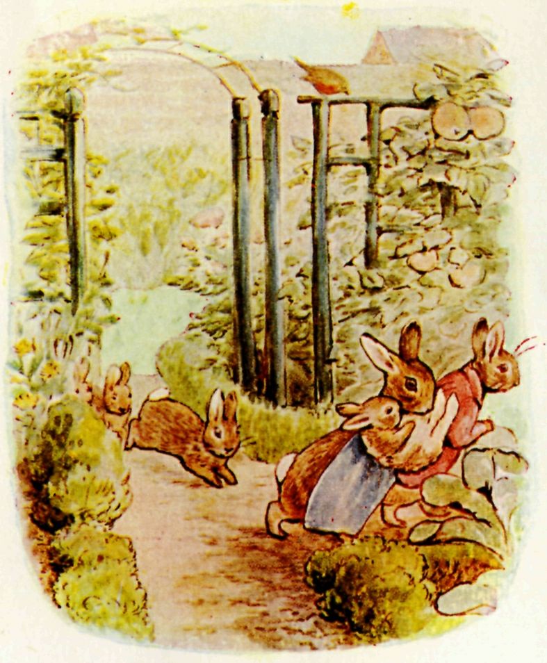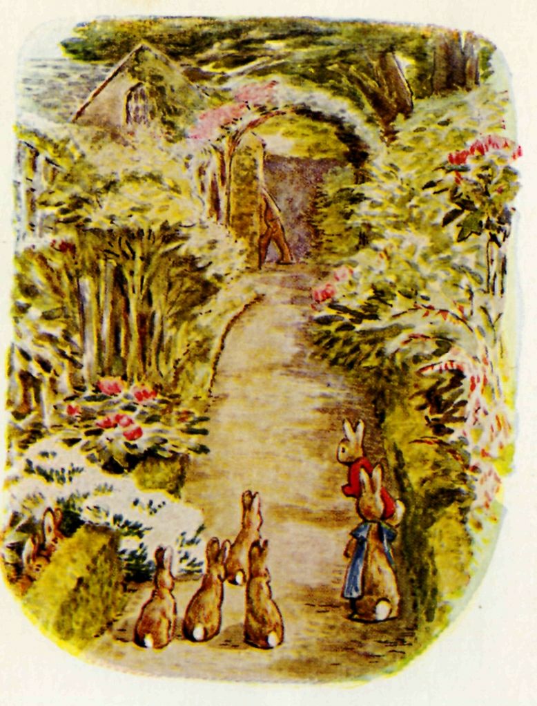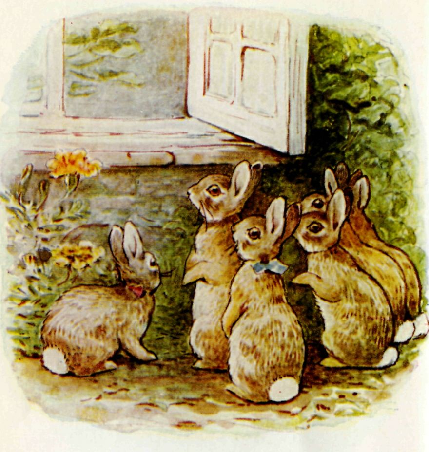 The little Flopsy Bunnies slept delightfully in the warm sun. From the lawn beyond the garden came the distant clacketty sound of the mowing machine. The bluebottles buzzed about the wall, and a little old mouse picked over the rubbish among the jam pots.