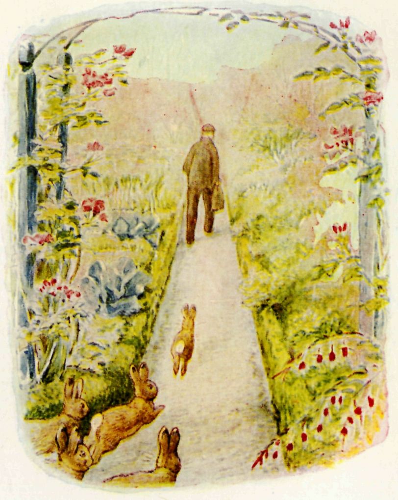 While she and Benjamin were talking, close under the wall, they heard a heavy tread above their heads; and suddenly Mr. McGregor emptied out a sackful of lawn mowings right upon the top of the sleeping Flopsy Bunnies! Benjamin shrank down under his paper bag. The mouse hid in a jam pot.