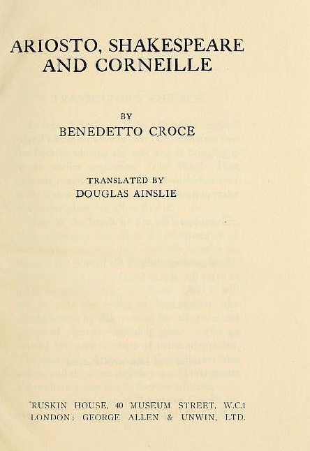 Now at the hands of her philosopher-critic, Italy offers us a first effort at reconstruction of our world-view with this masterly treatise on the greatest poet of the English-speaking world, so original and so profound that it will serve as guide to generations yet unborn. And it will not be only the critics of Shakespeare who should benefit by this treatise, but all critics and lovers of poetry—including prose—who go beyond the passive stage of mere admiration. The essays on Ariosto and Corneille are also unique and the three together should inaugurate everywhere a new era in literary criticism.