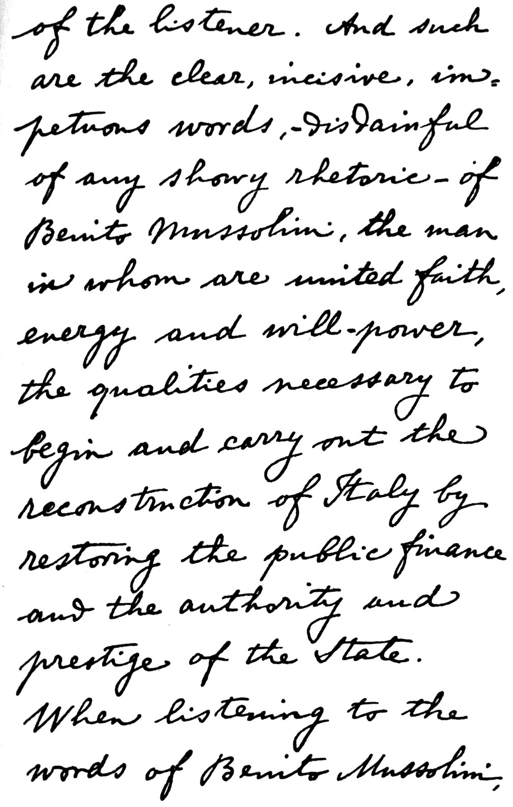 Mussolini is a volcanic genius, a bewitcher of crowds. He seems a regular warrior, with an indomitable daring, great physical and moral courage, and he has seen death near him without wavering. He is the real type of Roman Emperor, with a severe bronzed face, but which hides a kind and generous heart. He is what people call a real “self-made man,” and is a great lover of the violin and of all kinds of sport: fencing, cycling, flying, riding and motoring. Mussolini gets all he wants and quickly, and, as all his party do, knows exactly what he does want.