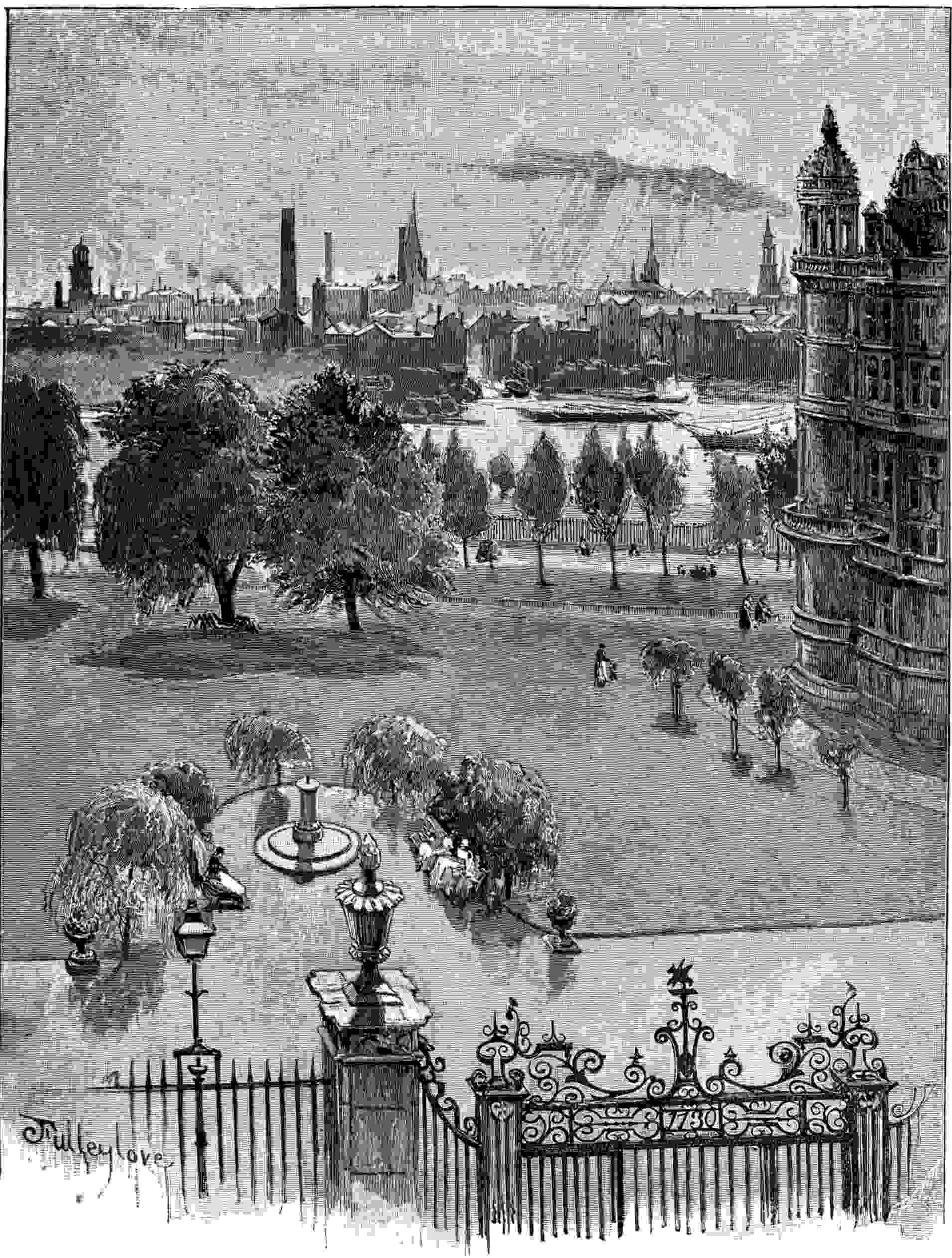They had, also, an aged school-dame here, who was proud to prattle to her pupils about her aforetime friend, Oliver Goldsmith; telling them how the good-natured man, then too poor to present her with a copy of his “Deserted Village,” had lent it to her to read. He had become famous now, and so affluent—by the success of “The Good Natur’d Man,” indeed!—that he had bought chambers on the second floor of No. 2 Brick Court, Middle Temple. This was but a biscuit toss from Crown Office Row, and perchance little Mary Lamb sometimes met, within the grounds, the short, stout, plain, pock-marked Irish doctor. He died in those chambers, only ten months before the birth of Charles; and was buried somewhere in the burying-ground of the Temple church. Within it, the Benchers put up a tablet to his memory. It is now in their vestry, wherein you shall also find the baptismal records of nearly all the Lamb children. The inscription on the tablet may have been first spelled out by Mary to her small and eager brother. Doubtless the two children knew the exact spot of his grave—{14}known exactly to none of us to-day—even as they knew every corner and cranny of the Temple grounds and buildings. They played in its gardens, and looked down on them from these same upper windows of No. 2 Crown Office Row, which have been selected by Mr. Fulleylove for his point of view. Then these gardens were as Shakespeare saw them, when he, by a blameless anachronism, caused to be enacted in them the famous scene of the Roses; really rehearsed there, years before, when Warwick assigned the rose to Plantagenet. Now, the grounds have been extended riverwards by the construction of the Embankment; and the ancient historic blocks of buildings about them have been vulgarized into something new and fine.