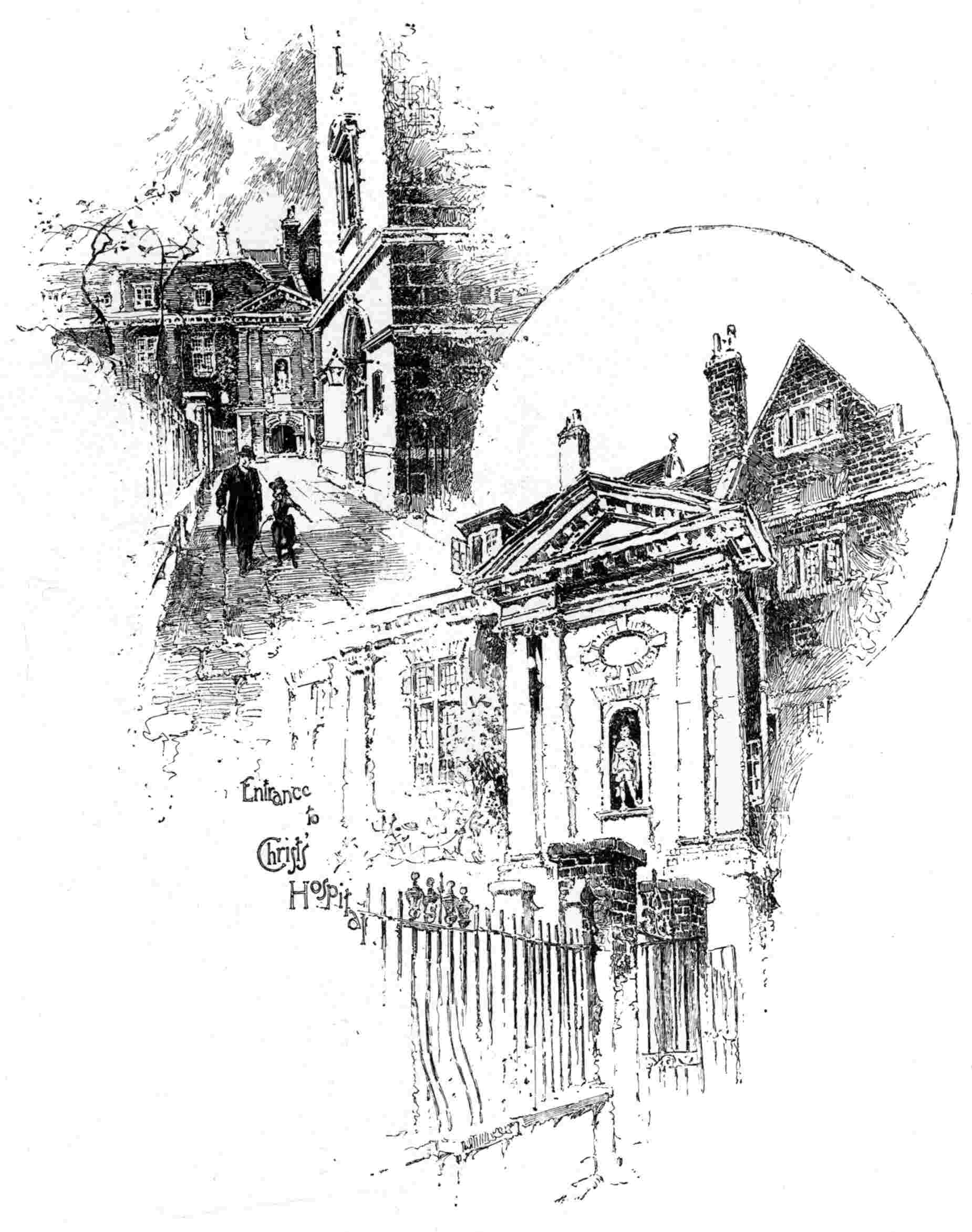 The boy’s next school, to which he obtained a presentation through the influence of Mr. Salt, is known officially as Christ’s Hospital, and is{17} commonly called the Blue-Coat School. It still stands, a stately monument of the munificence of “that godly and royal child, King Edward VI., the flower of the Tudor name—the young flower that was untimely cropped, as it began to fill our land with its early odours—the boy-patron of boys—the serious and holy child, who walked with Cranmer and Ridley.” To-day, as we stay our steps in Newgate Street, and peer through the iron railings at the dingy red brick and stone facings of the ancient walls; or, as we pause under the tiny statue of the boy-king—founder, only ten days before his death, of this noble hospital for poor fatherless children and foundlings—we may look at the out-of-school games going on in the great quadrangle: the foolish flapping skirts of the striplings tucked into their red leathern waistbands to give fair and free play to their lanky yellow legs, their uncapped heads taking sun or shower with equal unconcern.