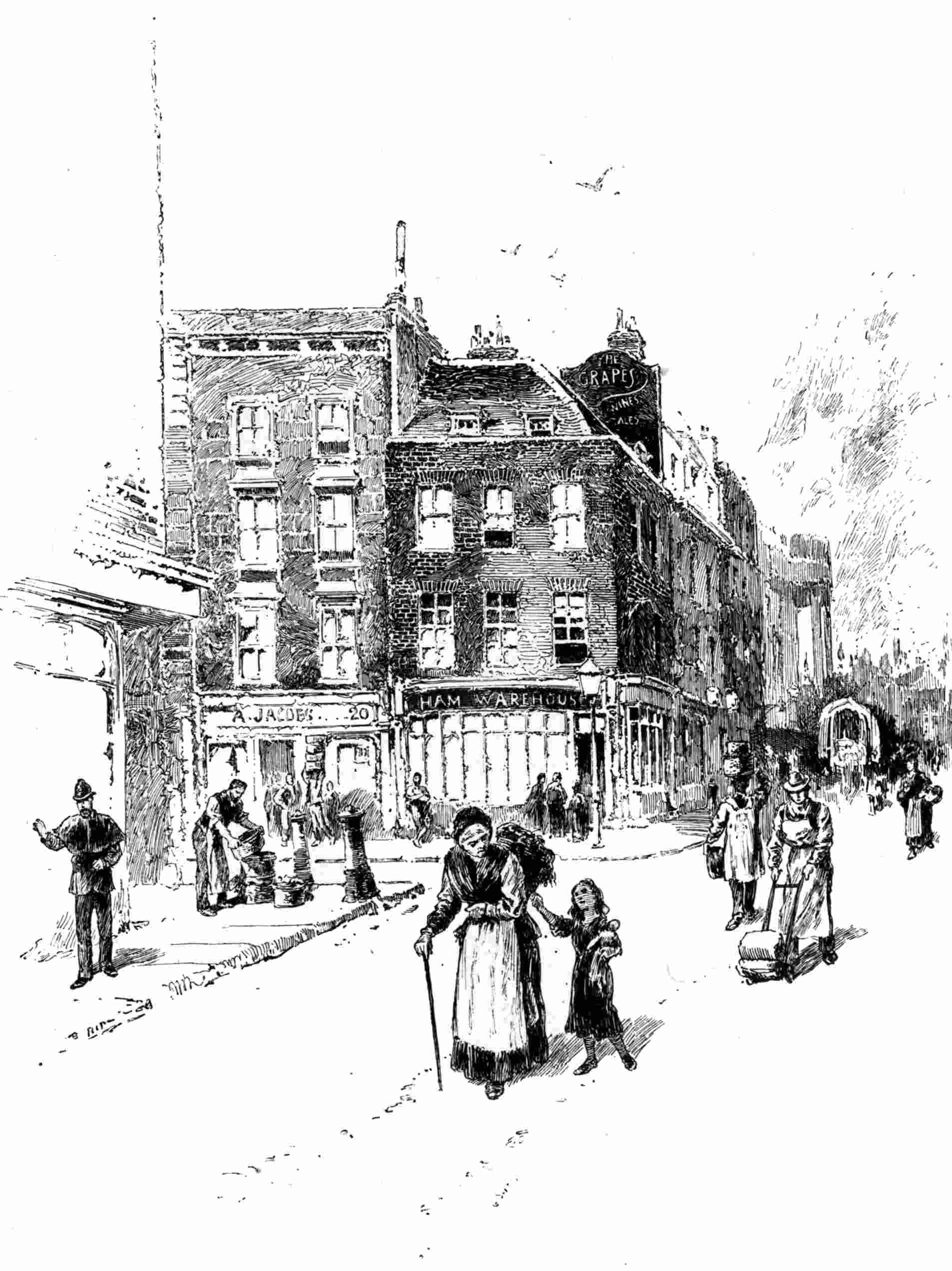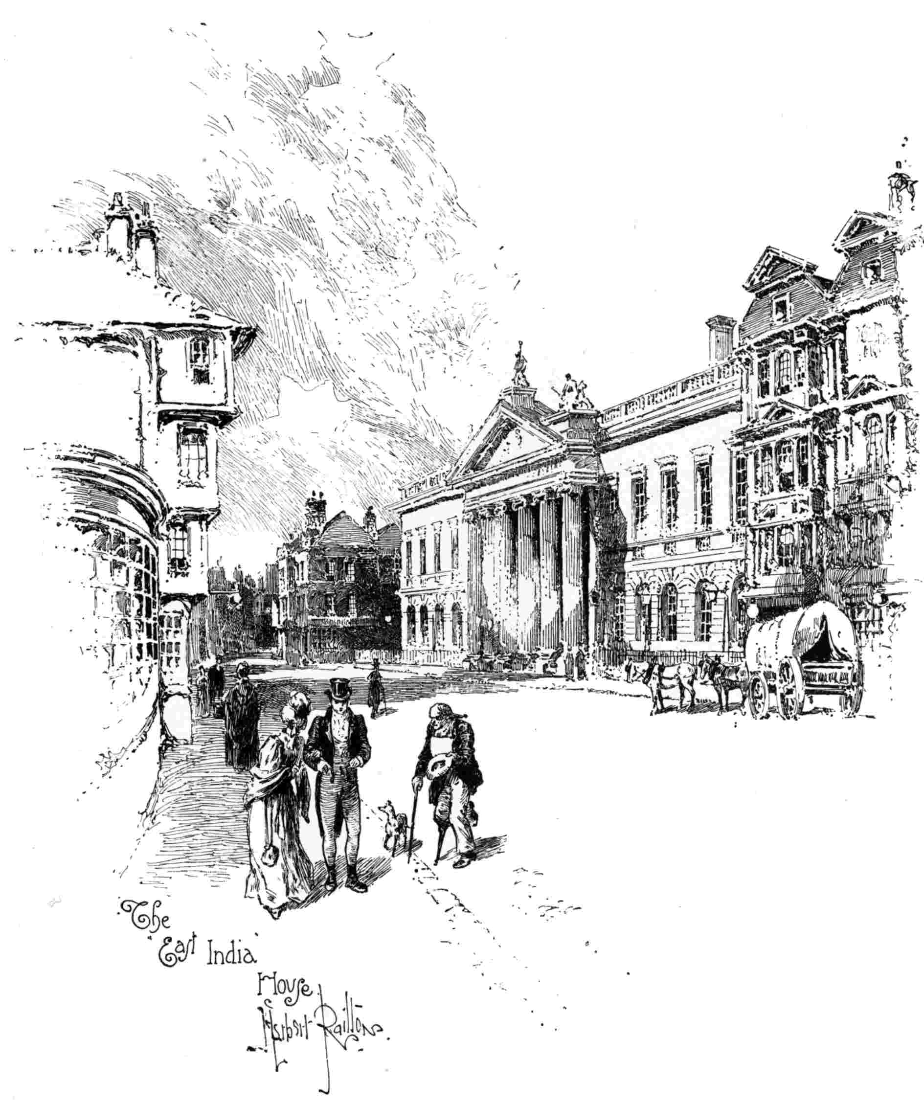 Until lately, in the year 1889, when the frenzy for Improvement and the rage for Rent wiped it out, I could have shown you a queer bit of cobble wall, set in and thus saved from ruin by the new wall of the Metal Exchange. These few square feet of stone were the sole remaining relic of the chapel of the old manor-house of Leadenhall—so named from its roofing of lead, rare in those days—which house had been presented to the City of London by the munificent Richard Whittington in 1408, to be used as a granary and market. It escaped the Great Fire, and its chapel was not torn down until June, 1812. This piece of its wall, having been preserved then, was built in with, and so formed part of, the old East India House. That famous structure stretched its stately and severe façade along Leadenhall Street just beyond Gracechurch Street, and so around the corner into Lime Street. It was, withal, a gloomy{27}