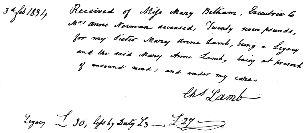 | Signed by Charles Lamb as Guardian for his Sister Mary. | |