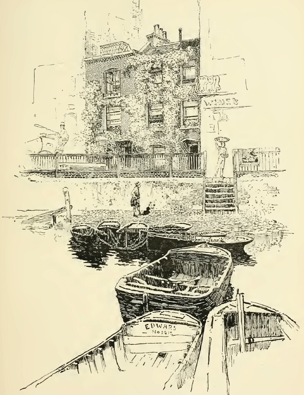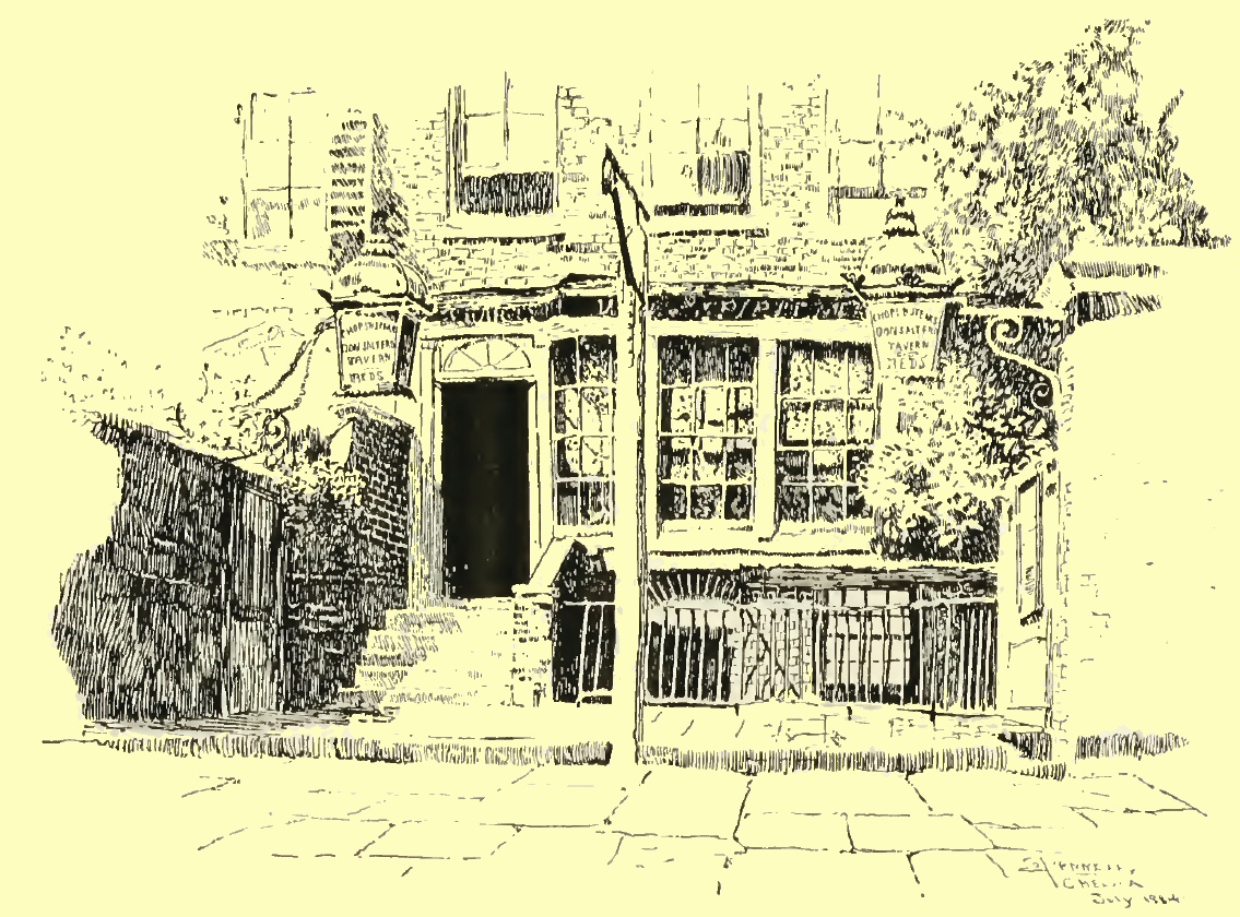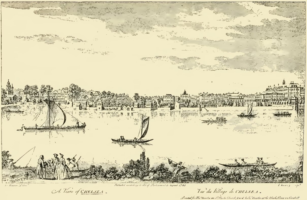 p. 33In taking you for a stroll to-day through Old Chelsea we will not stop to puzzle over the etymology of the name; whether it came from the Saxon, Chelchythe, or from Chesel, meaning gravel, and ea, meaning a bank: nor trace it back to its earliest appearance in Saxon chronicles, in 745, as the Hundred of Ossulston, Middlesex. You may see, if you choose, in the British Museum, the Charter of Edward the Confessor giving the “Manor of Chelsey to the Abbot and brothers of the Ministers of the West,” by whom it was rented for four pounds yearly. But it will not add to the interest of our stroll to learn that when it was a residence of Offa, King of the Mercians, there was a “Geflit-fullic” held here; nor that they had “a contentious synod.” Nor shall we altogether partake of the joy of one Maitland, sounding for many a day up and down the river, and at last finding, on the eighteenth of September, 1732, the very ford between Chelsea and Battersea, traversed by Cæsar’s army in pursuit of the flying Britons. For several centuries after the Conquest, the p. 34names Chelcheth or Chelchith were used indifferently; in the sixteenth century it began to be written Chelsey; and it is only since about 1795 that the modern spelling has prevailed.