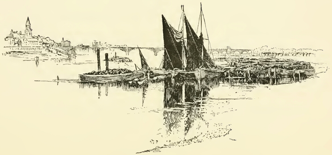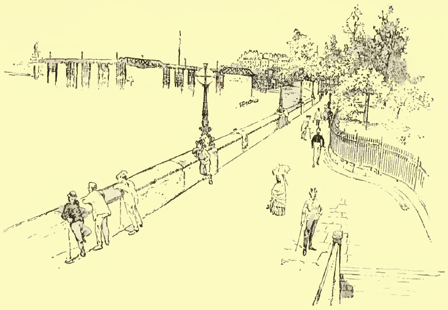 And on the river bank, although the old Roman and the old Norman wall and walk are replaced by the broad new Embankment and its smug gardens; although the insolent affectations of the Queen Anne mania stare stonily down on Cheyne Walk; all these have not been able to vulgarise this most delightful of promenades. Starting from Chelsea Barracks we p. 31can still walk under the old plane trees:—on our right the ancient Dutch-fronted houses, so prim, so secluded, so reserved; on our left the placid flow of the storied Thames, broadened here into Chelsea Reach:—to dingy, dear old Battersea Bridge, and so on to Sand’s End. At each end of our walk are the two small rivulets which bounded the old parish east and west; one is now arched over and flows unseen beneath the tread of busy feet; the other serves as a railway cutting and carries rattling trains: so the old-time memories of the place now either flow underground, or are modernised and become part of its daily life.
