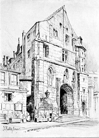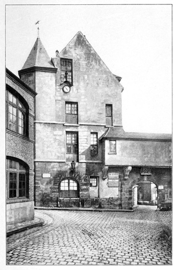 When the Franciscan monks, who were called Cordeliers because of their knotted cord about the waist, came to Paris early in the thirteenth century, they were given a goodly tract of ground just within the Saint-Germain gate, stretching, in rough outlines, from Rues Antoine-Dubois and Monsieur-le-Prince nearly to Boulevards Saint-Germain and Saint-Michel. The church they built there was consecrated by the sainted 230 Louis IX. in 1262, and when burned, in 1580, was rebuilt mainly by the accursed Henri III. New chapels and cloisters were added in 1672, and there were many other structures pertaining to the order within these boundaries. Of all these, only the Refectory remains to our day. The site of the church, once the largest in Paris, is covered by Place de l'École-de-Médecine and by a portion of the school; something of the shape and some of the stones of the old cloisters are preserved in the arched court of the Clinique; bits of the old walls separate the new laboratories, and another bit, with its strong, bull-nosed moulding, may be seen in the grounds of the water-works behind No. 11 Rue Racine, this street having been cut through the monks' precincts, so separating the Infirmary, to which this wall belonged, and that stretched nearly to the rear walls of Lycée Saint-Louis, from the greater portion of "Le Grand Couvent de l'Observance de Saint François."