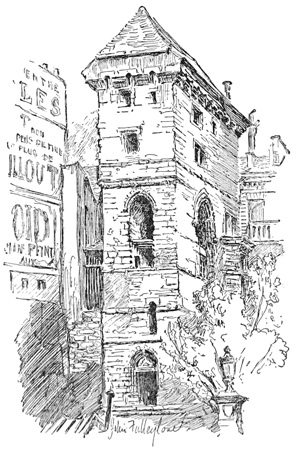 By the courtesy of those in charge, we may pass within the spacious stone entrance arch of No. 18, and pick our way through the ordered confusion, past the admirable inner façade of the main fabric, with its stately steps and portal and its windows above, topped by tiny hoods, to a distant corner; where, in the gloom, we make out the base of a square tower and the foot of a corkscrew staircase. We mount it, spirally and slowly. The well-worn stone steps are narrow, and the turn of the spiral is sharp, for this tower was built when homes were fortresses, when space was precious, and when hundreds huddled within walls that will hardly hold 17 one thriving establishment of our day. In this steep ascent, we get scant assistance from our hold on the rude hand-rail, roughly grooved in the great central column—one solid tree-trunk, embedded in the ground, stretching to the top of the stairs. Experts assure us that this tree was fully five hundred years old, when it was cut down to be made the shaft of this stairway, nearly five hundred years ago. For this stone tower is evidently of late fifteenth-century construction. The mediæval towers were round, whether built upon their own foundations or rebuilt from Roman towers; and they gave way to square towers when battering-rams gave way to guns, in the fifteenth century. Yet this pile of masonry is known as "la tour de Dagobert," and with no wish to discredit this legend, cherished by the dwellers in this quarter, we may quote Brantôme concerning certain local traditions of the Tour de Nesle: "Je ne puis dire si çela soit vrai, mais le vulgaire de Paris l'affirme."