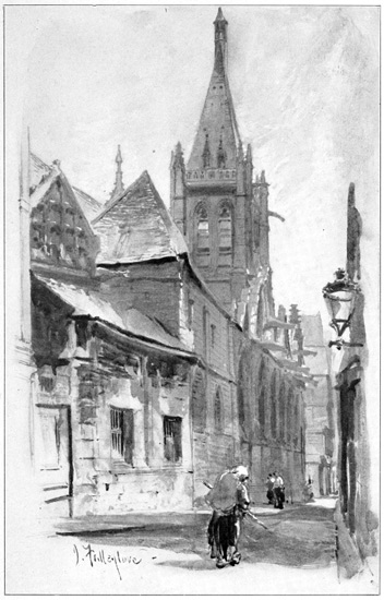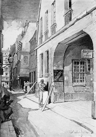 Beyond the cathedral square, over the bronze Charlemagne on his bronze horse, glints the untravelled narrower arm of the Seine; we turn our heads and look at its broader surface, all astir with little fidgetty bateaux-mouches and big, sedate barges. At both banks are anchored huge wash-houses and bathing establishments. From this island-centre all Paris spreads away to its low encircling slopes, to the brim of the shallow bowl in which it lies. In sharp contrast with all that newness, our old tower stands hemmed about by a medley of roofs of all shapes and all ages; their red tiles of past style, here and there, agreeably mellowing the dull dominant blue of the Paris slate. On these roofs below jut out dormers, armed with odd wheels and chains for lifting odd burdens; here on one side is an outer staircase that starts in vague shadow, and ends nowhere, it would seem; far down glimmers the opaque gray of the glass-covered courts at our feet. A little toward the north—where was an entrance to this court, in old days, from a gateway on the river-bank—is the roof that sheltered Racine, along with the legal gentry 20 of the Hôtel des Ursins. And all about us, below, lies the little that is left of la Cité, the swept and set-in-order leavings of that ancient network of narrow streets, winding passages, blind alleys, all walled about by tall, scowling houses, leaning unwillingly against one another to save themselves from falling. This was the whole of Gallic Lutetia, the centre of Roman Lutetia, the heart of mediæval Paris, the "Alsatia" of modern Paris; surviving almost to our time, when the Second Empire let light and air into its pestilent corners. Every foot of this ground has its history. Down there, Villon, sneaking from the University precincts, stole and starved and sang; there Quasimodo, climbing down from his tower, foraged for his scant supplies; there Sue's impossibly dark villany and equally impossible virtue found fitting stage-setting; there, François, honest and engaging thief, slipped narrowly through the snares that encompassed even vagabonds, in the suspicious days and nights of the Terror.