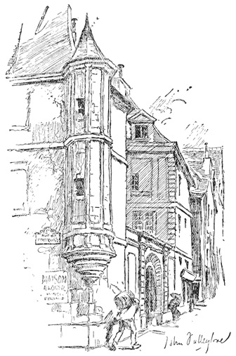 More than suggestions of the wall itself may be got by actual sight of sections that survive, despite the assertions of authorities that no stone is left. At the end of Impasse de Nevers, within a locked gate, you may see a presumable bit. In the court that lies behind Nos. 27 and 29 Rue Guénégaud is a stable, and deep in the shadow of that stable lurks a round tower of Philippe-Auguste, massive and unmarred. At No. 4 Cour du Commerce a locksmith has his shop, and he hangs his keys and iron scraps on nails driven with difficulty between the tightly fitted blocks of another round tower. Turn the corner into Cour de Rohan—a corruption of Rouen, whose archbishop had his town-house here—and you shall find a narrow iron stairway, that mounts the end of the sliced-off wall, and that carries you to a tiny garden, wherein small schoolgirls play on the very top of that wall. Down at the end of Cour de Rohan is an ancient well, dating from the day when this court lay within the grounds of the Hôtel de Navarre, the property of Louis of Orleans before he became Louis XII. In style it was closely akin to the Hôtel de Cluny, and it is a sorrow that it is lost to us. Its entrance was at the present Nos. 49 and 51 of Rue Saint-André-des-Arts, and the very ancient walls in the rear court of 35 the latter house may have belonged to the Hôtel de Navarre. When Louis sold this property, one portion was bought by Dr. Coictier, who had amassed wealth as the physician of Louis XI., and this well was long known by his name. It has lost its metal-work, which was as fine as that of the well once owned by Tristan l'Hermite, Coictier's crony, and now placed in the court of the Cluny Museum.