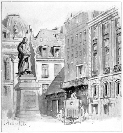 "Dans la cour du Palais, je naquis ton voisin," wrote Voltaire to Boileau, in one of those familiar rhymed letters that soften the austere rhetoric of the French verse of that day. The place of Voltaire's birth, nearly sixty years after that of Boileau, was in the same Street of Jerusalem, at its corner with the Street of Nazareth, and it was only thus as a baby that he came ever in touch with the Holy Land. On November 22, 1694, the day after his birth, he was carried across the river to Saint-André-des-Arts—no one knows why his baptism was not in the island church of the parish—and there christened François-Marie Arouet. His earlier years were passed in the house of Boileau's nephew Dongois, whose airs of importance did not escape the keen infant eyes, as we have seen in the same letter in verse in our preceding chapter. Then he was sent to Lycée Louis-le-Grand, whither we have gone with young Poquelin, seventy years earlier. The college stands in its new stone on its old site in widened Rue Saint-Jacques.