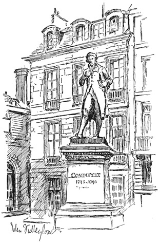 It is difficult to refrain from undue admiration and pity, to remain temperate and modest, when one dwells on the character and qualities, the blameless life and the ignominious death, of Marie-Jean-Antoine-Nicolas Caritat, Marquis de Condorcet. We may look up at his thoughtful face in bronze on Quai Conti, alongside the Mint, where he lived in the entresol of the just completed building, when appointed Director of the Hôtel de la Monnaie by his old friend Turgot, in 1774. We may look upon the house in Rue Servandoni where he hid, and from which he escaped to his death. His other Paris homes have no existence now. His college of Navarre—oldest of all those in the University—has been made over into the École Polytechnique; and the house he built for himself in Rue Chantereine, which was afterward owned by Josephine Beauharnais, has long since disappeared. When only twenty-two years of age he wrote his famous essay on the Integral Calculus, when twenty-six he was elected to the Academy of Sciences. Made Perpetual Secretary of that body in 1777, it came in the course of his duties to deliver eulogies on Pascal, d'Alembert, Buffon, and Franklin, and others of the great guild of science. These are more than perfunctory official utterances, they are of 250 an eloquence that shows his lovable character as well as his scientific authority. He contributed largely to Diderot's Encyclopædia, and put forth many astronomical, mathematical, and theological treatises during his busy life. He wrote earnestly in favor of the independence of the American colonies, and was one of the earliest advocates of the people's cause in France. But he was much more than a man of science and of letters; he was a man with a great soul, "the Seneca of the modern school," says Lamartine; the most kindly and tolerant friend of humanity, and protector of its rights, since Socrates. He believed in the indefinite perfectibility of the human race, and he wrote his last essay, proving its progress upward, while hiding in a garret from those not yet quite perfect fellow-beings, who were howling for his head! He was beloved by Benjamin Franklin and by Thomas Paine. Members of the Convention together, he and Paine prepared the new Constitution of 1793, in which political document they found no place for theological dogma. Robespierre prevented the adoption of this Constitution, having taken God under his own protection. Condorcet made uncompromising criticism, and was put on the list of those to be suspected and got rid of. Too broad to ally himself with the Girondists, he was yet proscribed with them, on June 2, 1793. His friends had forced him to go into hiding, until he might escape. They had asked Madame Vernet—widow of the painter Claude-Joseph, mother of Carle, grandmother of Horace—to give shelter to one of the proscribed, and 251 she had asked only if he were an honest man. This loyal woman concealed him in her garret for nearly one year, and would have kept him longer, but that he feared for her safety, and for that of his wife and daughter, who might be tracked in their visits to him by night. He had finished his "Esquisse d'un Tableau historique des Progrès de l'Esprit humain," full of hope for humanity, with no word of reproach or repining, and then he wrote his last words: "Advice of one proscribed, to his Daughter." This is to be read to-day for its lofty spirit. He gives her the names of certain good men who will befriend her, and among them is Benjamin Franklin Bache, the son of our Franklin's daughter Sally, who had been in Paris with his grandfather.