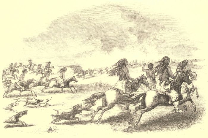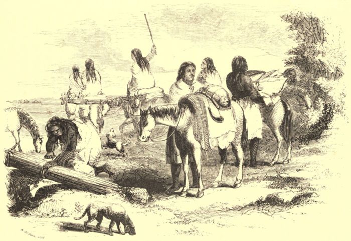 I mounted behind him, and we travelled all day in the direction of Cape Virgin. For two days and nights I had eaten nothing, and drunk nothing but sea-water, and, in fact, had taken very little food for three days. We arrived about dark at an eminence commanding a view of their new squatting ground. Here we halted to take a short survey of the encampment. To them, doubtless, the prospect was beautiful; to me it was heart-sickening, but I strove to keep up cheerful appearances. Down in a valley or deep marshy hollow, covered with tall grass or rushes, an almost innumerable drove of horses were seen grazing; and beyond, at a short distance, the surface was thickly dotted with huts, erected, or in process of erection, by female architects. Children, in swarms like summer flies, and with no more artificial covering than those insects, were capering and shouting in high glee. At length we descended to the rude village; after tacking about, first to the right and then to the left, like a ship against a head wind, we came gallantly into town, and drew up at the[Pg 65] chief’s lodge. I was glad to dismount, sore with bestriding the skeleton of a horse.