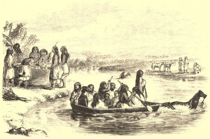 On catching sight of them, I desired the Indians to conduct me to the shore, and receive the ransom. But this they declined. They ordered me to the summit of an eminence near by, there to beckon the men to come ashore. An old skin was given me to wave as a signal. Perceiving that I was to be used as a decoy to lure the others into their treacherous snare, and secure them all as prisoners, I protested against this new breach of faith, and assured them that our men would not leave their boat, but that, if they wanted any rum and tobacco, they must take me to the shore. To this, after a long palaver, and with visible[Pg 35] reluctance, they assented. The old chief ordered me to mount his horse,—this time reversing our relative positions; he made me sit on the rude apology for a saddle and guide the horse, while he took his seat behind, clasping both arms tightly around my body, and spurring his old nag forward. Thus mounted, and wondering what would be the next trick of the savages, I was conveyed to the shore, near the spot where the boats lay off on their oars. Driving as near them as possible, I hailed the men,—told them by no means to fire on the Indians, but to give them all they had promised. They asked what they should do with the articles. I turned to the chief, told him what the boats had brought, and once more asked if it was a satisfactory ransom. He said, Yes; if those articles were laid down, I should be released. But he was plainly resolved to have his pay in advance; he distrusted us too much to let me go first; and I need not say that my confidence in him was far from implicit. But, “Nothing venture, nothing have,”—I directed the men to put the things ashore, which they did. The Indians greedily picked them up, and I claimed my release. The old rascal said, “he had not got plenty of rum yet, he must have a barrel.” I insisted and struggled, but to no purpose. He kept a tight hold of my body, and when I begged that at least he would not squeeze me quite so painfully, he only redoubled his clasp. He obviously suspected, and I more than suspected, that it would not require a very great relaxation of his embrace to prompt a pretty decided movement on my part, for the effectual resisting of which the vicinity of the water was not altogether favorable. He now began spurring his old horse from the scene of action; I drew upon the bridle[Pg 36] with my whole available force and weight; but the disparity between human strength and horse power, stimulated to its utmost by the spur, was too great. I begged the men in the boats to come again the next morning, and on no account to leave me, which they solemnly promised.
