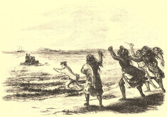The next morning, it being calm, some of our men went on shore in the small boat, for a gunning excursion. They[Pg 28] returned early in the forenoon, with a large number of sea-fowl. Not long after, Captain Brownell announced his intention to go ashore, and commenced making preparations. He soon changed his mind, however, and asked me to go, in his stead, to procure some fresh provisions, if they were to be had. Knowing, from the reports of whalers and others, something of the savage character of the natives, I felt reluctant to venture; but afterwards, to oblige the captain, I complied.