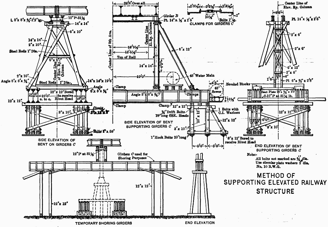 As a rule, no jacking of the elevated railway structure was done while trains were passing over, and trains were flagged during the operation. There was generally very little delay, as all jacking was done between 10.30 a.m. and 2.30 p.m., when the traffic was lightest, and frequently the jacking was done between trains, causing no delay whatever. Steel clamps were placed, three on the top and three on the bottom of each set of the girders "C," to bind them together and cause them to act as a unit.