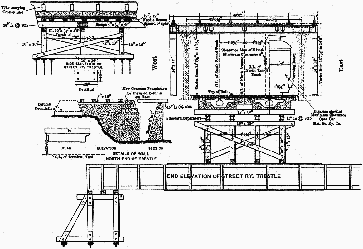 The columns carrying the structure are of fan top design, with the points of bearing near the extremities at the top; each of the outside tracks is supported on two longitudinal latticed girders and the central [307]track on two plate girders; between the columns, transverse girders are spliced to the outside track cross-frames, and carry the central track system. It was not thought desirable to put brackets on the columns near the street level to support the structure temporarily, and, as there is an expansion joint at each column, and as the transverse girders carrying the central track system are not rigidly attached to the longitudinal girders carrying the outside tracks, the central track could not be supported by supporting the outside tracks; therefore, independent supports for each track, in the form of overhead girders, had to be provided. The columns rest on brick piers, each having four 2-in. anchor-bolts. The brick foundations on the west side are wide in order to allow a 24-in. water main to pass directly beneath the columns. The foundations are usually on rock.