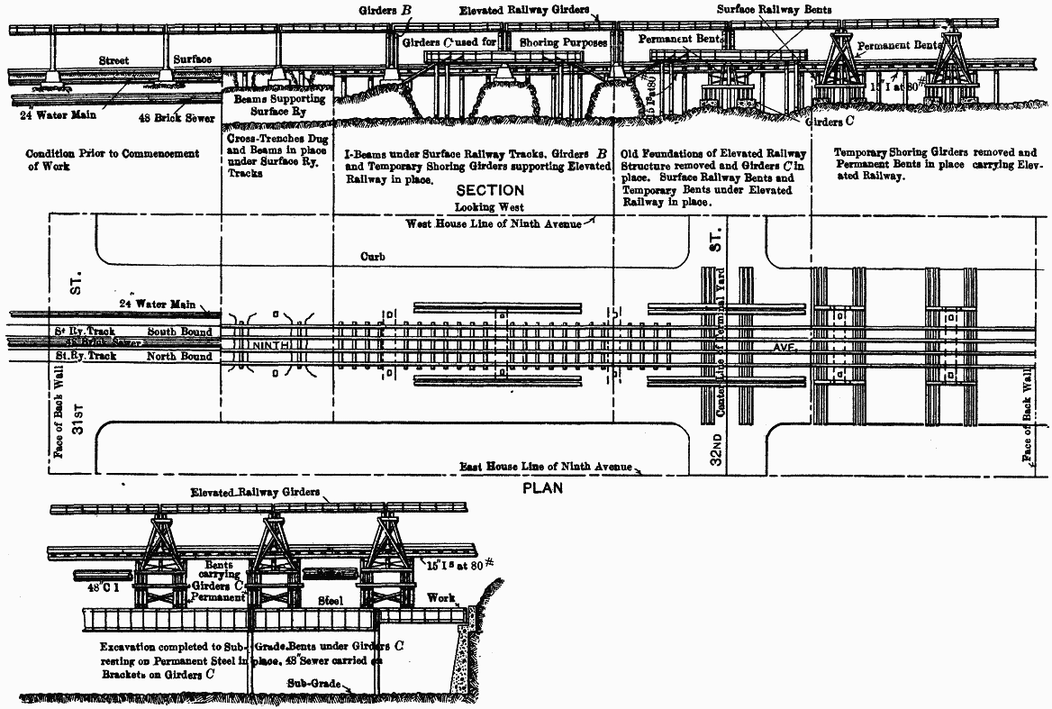 The general method adopted was as follows: The east and west sides of the avenue were closed, vehicular traffic was turned into the center, and a trestle for pedestrians was constructed west of the westerly elevated railway columns. All structures were then supported on transverse girders, running across the avenue, below the surface, and these rested on concrete piers on the central rock core. The sides of the avenue were then excavated to sub-grade, and the permanent steel viaduct was erected on both sides of the avenue as close as possible to the central rock core. The weight of all structures was then transferred to the permanent steel viaduct, erected on the sides of the avenue, by timber bents under the transverse girders resting on the permanent steel viaduct, and all weight was thus taken off the central rock core. This core was then excavated to sub-grade, the permanent viaduct was completed, and all structures were placed on its deck, using concrete piers and timber bents.