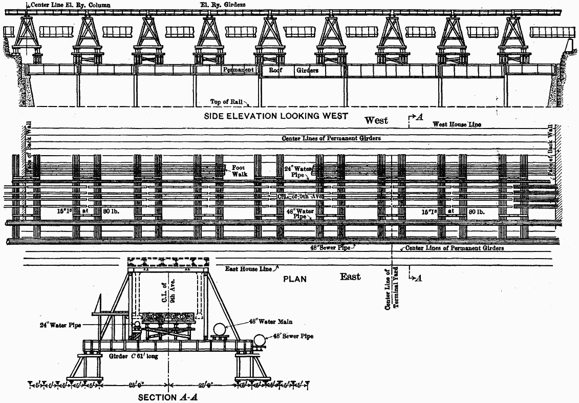 General Description.—The work involved the excavation of about 375 ft. of the full width of Ninth Avenue to an average depth of about 58 ft., and the construction over this area of a steel viaduct, the deck of which was about 24 ft. below the surface, for the ultimate support of the Ninth Avenue structures.