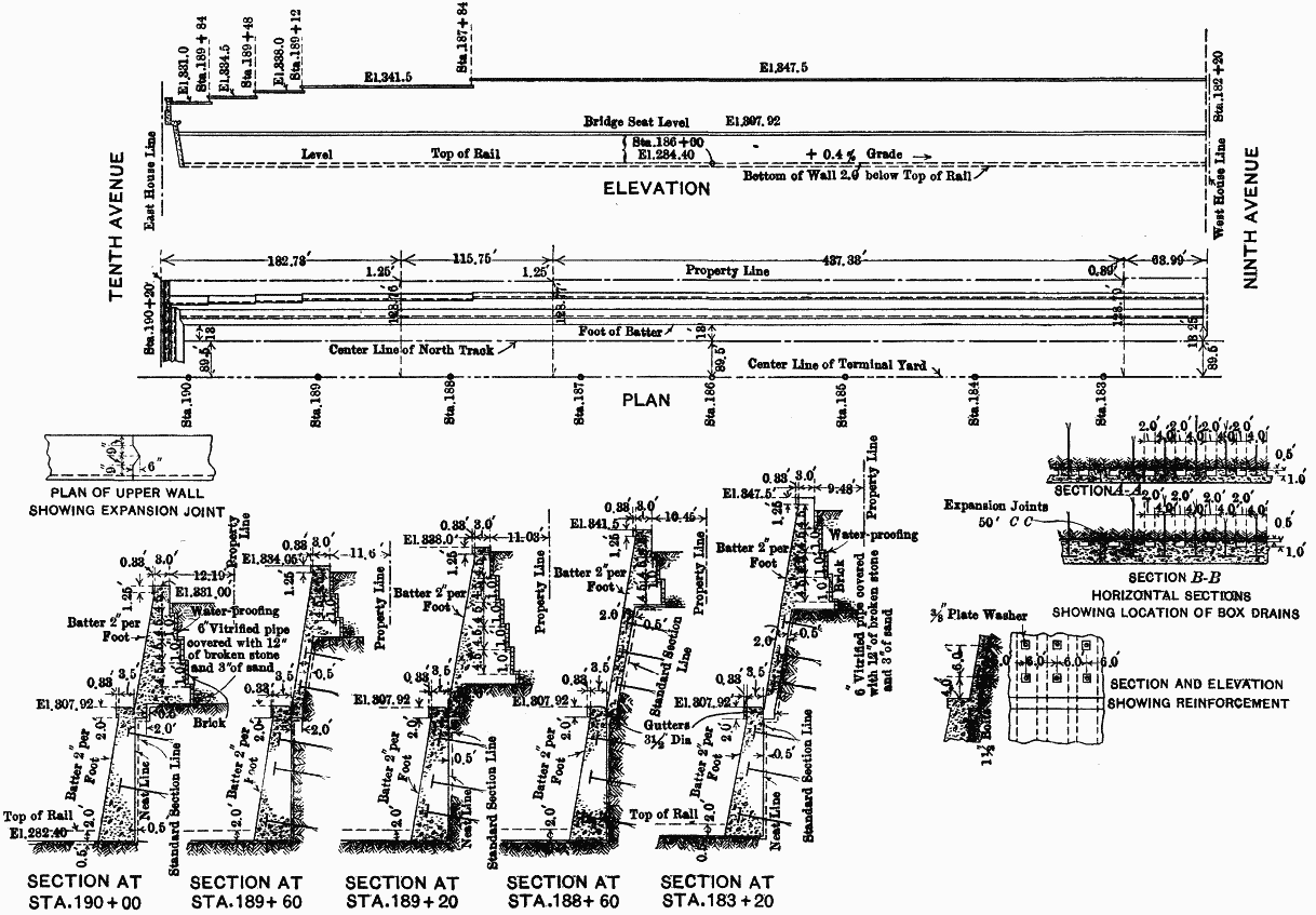 These box drains occurred so frequently, and decreased the section of the wall so materially, that it was thought desirable to tie the wall to the rock. This was done by drilling into the rock holes from 6 to 15 ft. in depth, and grouting into each hole a 1½-in. rod having a split end and a steel wedge. The outer end of each rod was fitted with a 12 by 12 by ½-in. plate and a nut, and extended into the wall, thus tying the concrete securely to the rock. The drains being 6 ft. from center to center, the tie-rods were placed midway between them, and 6 ft., from center to center, vertically and horizontally. Fig. 8 shows the arrangement of these rods and drains. Around the Express Building site, just west of Ninth Avenue, on the south side of the work, the bridge seat was omitted, and the face wall was designed 2 ft. thick from top to bottom. The batter on the 31st Street wall was made variable, the top and bottom being constant distances from the center line and on different grades.