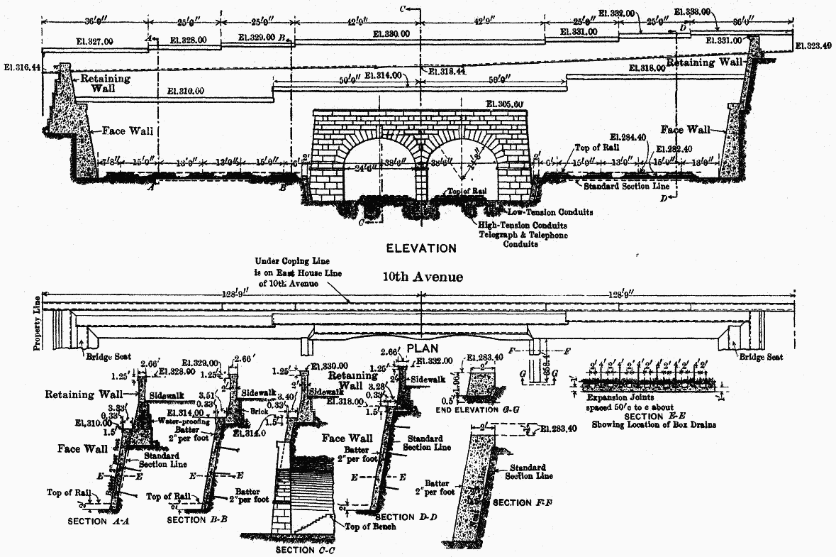 The face of the concrete wall was rubbed and finished in a manner similar to that used on the walls between Ninth and Tenth Avenues, as described later.