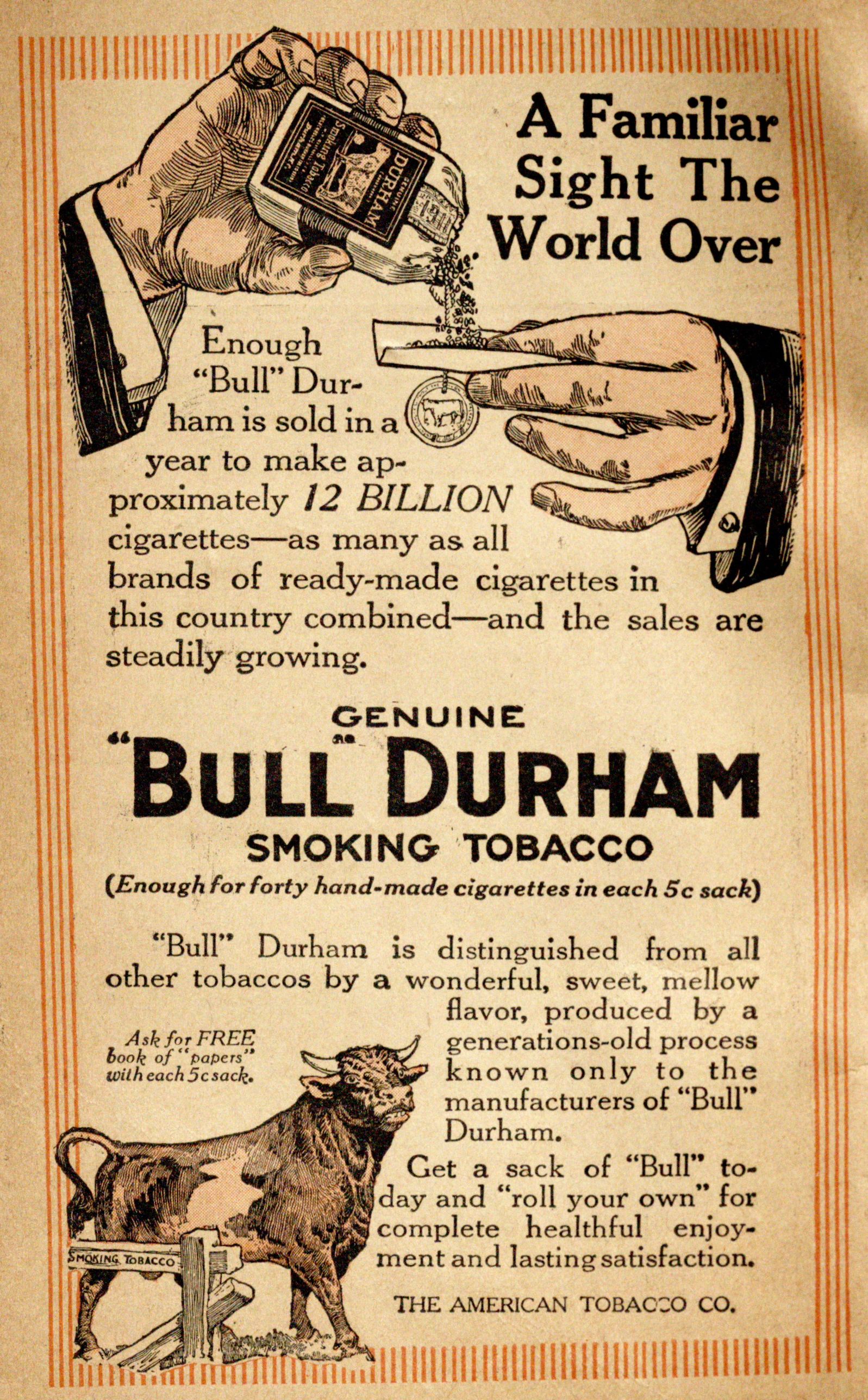 Enough “Bull” Durham is sold in a year to make approximately 12 BILLION cigarettes—as many as all brands of ready-made cigarettes in this country combined—and the sales are steadily growing.