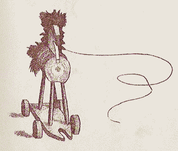 Upon his wooden back;