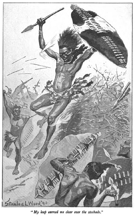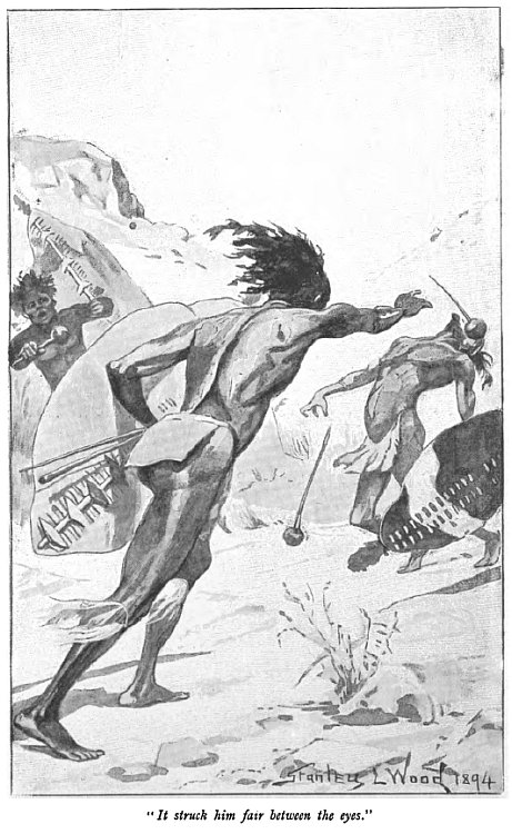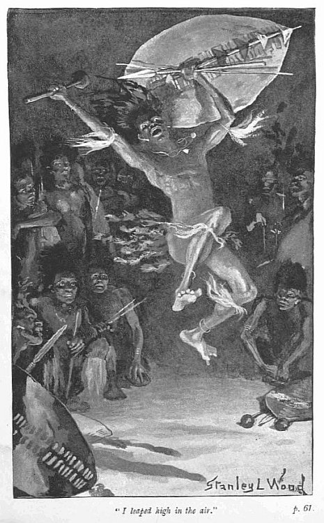 “Then I sprang to my feet with a fearful roar. I whirled in among them while yet the terror of surprise was upon them, and cut down two, ripping them with my broad spear. Another I brained with my knobstick, but by that time the whole tribe was upon me shrieking. Assegais whizzed past my ears, one slightly wounding Nangeza, who, wakened suddenly, had sprung to my aid armed with a heavy knobstick of her own.