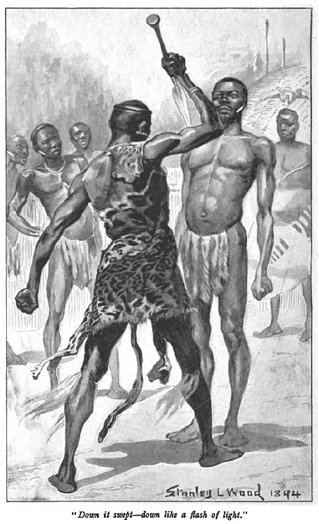 “‘Good! Then I will treat thee even as one of these miserable Baputi.’ And, quick as thought, before a hand could be lifted to prevent it, I hurled my great knobstick at his head. It struck him fair between the eyes, crashing with terrific force. Njalo-njalo dropped like an ox smitten by lightning. He never moved afterward: