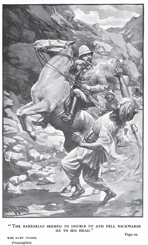 With a bitter curse upon the pettifogging dishonesty of his trading fellow countrymen, the now desperate man wrenched off one of the stirrups—not a bad weapon at a pinch—But once more fortune befriended him. The horse, spurred by terror to one more effort, plunged down the road, which now made a sudden descent. The stunning report of a jezail, which the Ghazis had presumably stopped to reload, added to its terror, but the missile hummed harmlessly by. And now in the ceaseless gleam of the lightning, the fugitive saw right before him at the base of the slope, the wide stony bed of a watercourse.