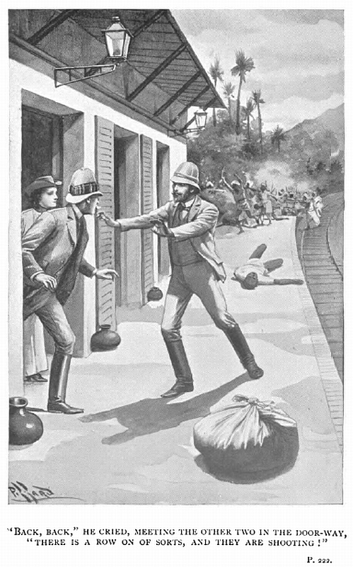Campian, however, was quick and resourceful in his strait. In a flash, as it were, he had whirled Buktiar’s tulwar from its scabbard as the ex-chuprassi was still leaning over his camel-gear, and with a rapid cut had slashed the face of the foremost of the ferocious crew which now hurled itself, howling, upon him. Then two or three quick bounds backward and he was within his apartment, with the door banged to, and the charpoy and a heavy chest which stood in the room so wedged against it that it could not be forced by any method short of knocking out the opposite wall.