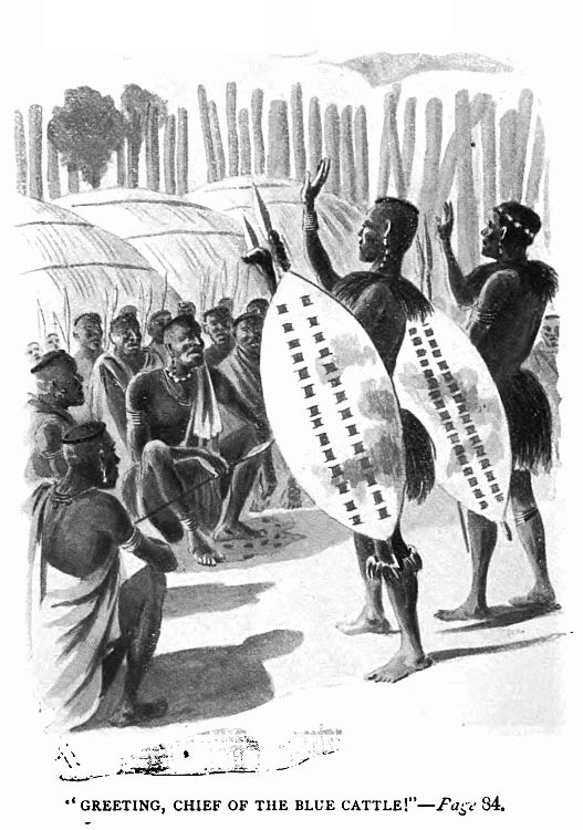Having sent messengers on to announce our arrival, we entered the great kraal, singing lustily the praises of the King. Umzilikazi was seated in his wonted place, at the upper end of the great open circle, and as we flung our weapons to the ground and, tossing our right hands aloft, roared the Bayéte, I could see that pleased expression I knew so well steal over his face.