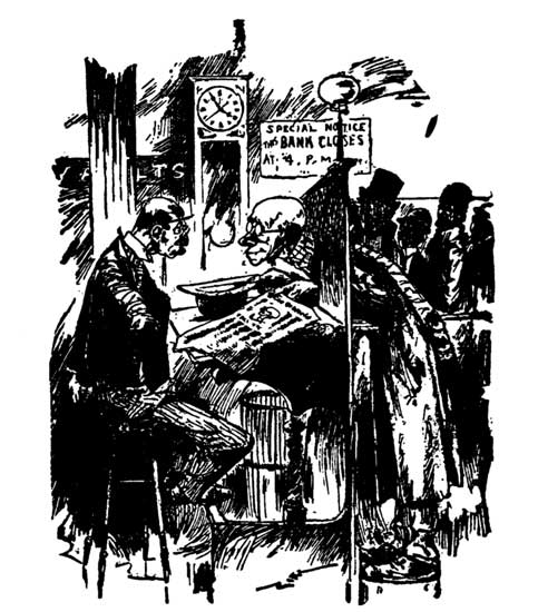 "I'll have to ask you to stand aside, I guess, and give that string of people a chance. You have no right to take up my time in this way. The rules of the bank are inflexible. We must know who you are, even before we accept your deposit."[Pg 233]