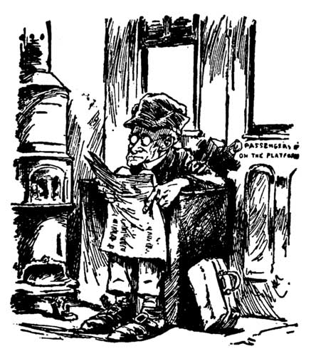 Let it be understood, then, that we are wholly irresponsible, and we are glad of it. We do not care who knows it. We will not even hold ourselves responsible for the pictures in this book, or the hard-boiled eggs sold at points marked as meal stations in time tables. We have gone into this thing wholly unpledged, and the man who gets up before he is awake, in order to catch any East bound, or West bound, North bound, South bound, or hide-bound train, named in this book, does himself a great wrong without in any way advancing our own interests.