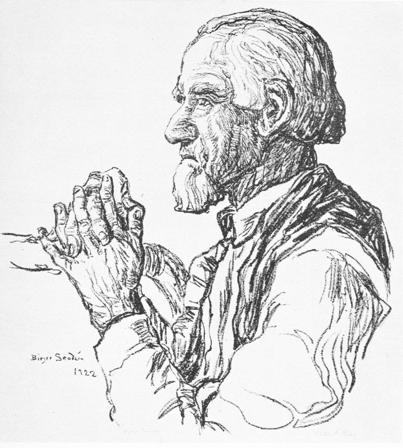 He saw faces in which courage had drawn with a true hand lines of self-conquest. He saw the beauty of fingers knotted and bent with much serving and the glory of dimmed eyes. The pioneer men and women of Kansas were crowned by Sandzen with the splendor of their deeds.