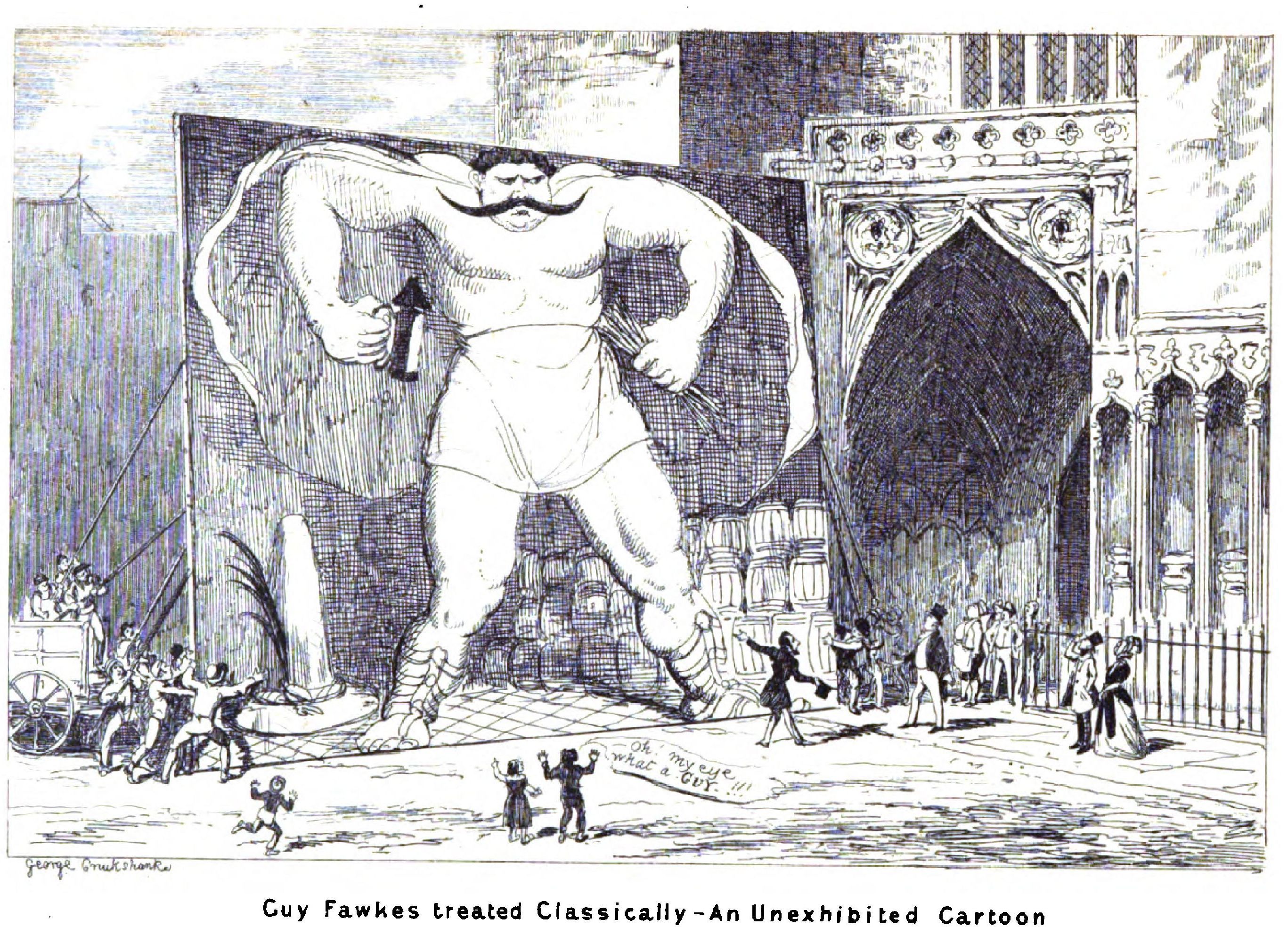 “Having strolled towards Westminster Hall to survey the scene of my future triumphs, it struck me that I had carried the grand classical to such a height as to preclude all chance of my cartoon being got in through the doorway; and I therefore, with the promptitude of a Richard the Third, determined to ‘off with his head’ by taking a slice off the top of the canvas. This necessary piece of execution rather spoiled the design, but it enabled me to throw a heaviness into the brows of my principal figure, which, if it marred the resemblance to Fawkes, gave him an additional look of the Guy at all events. It then occurred to me that I might diminish the dimensions by taking a couple of feet off the legs; and this happy idea enabled me to carry out the historical notion that Fawkes was the mere tool of others, in which case, to cramp him in the understanding must be considered a nice blending of the false in art with the true in nature. The Guy’s feet were accordingly foreshortened, till I left him as he appeared when trying to defend himself at his trial, with hardly a leg to stand upon. Besides, I knew I could fresco out his calves in fine style, when once I got permission to turn the fruit of my labours into wall fruit on the inside of the Houses of Parliament.