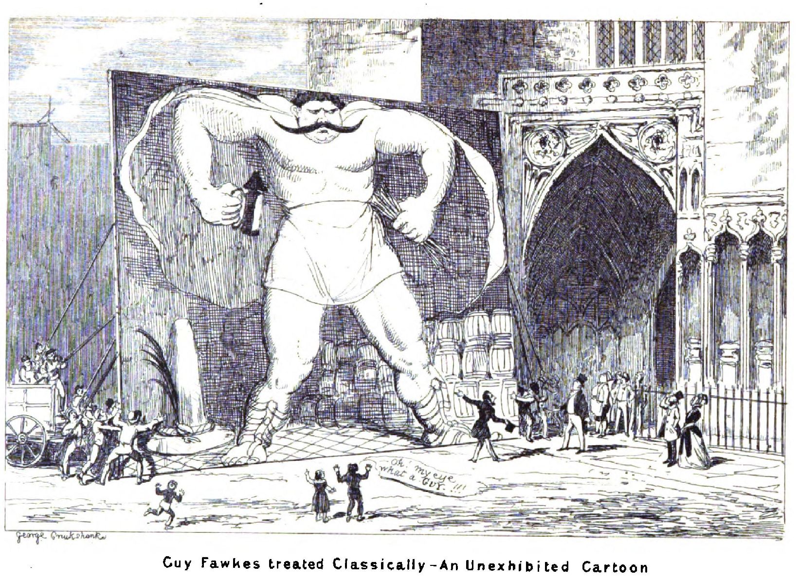 “It will be seen that the arch-conspirator—for so I must continue to call him, though he could not be got into the archway—has placed his hat upon the ground, a little point in which I have blended imagination with history, and both with convenience. The imagination suggests that such a villain ought not to wear his hat; history does not say that he did, which is as much as to hint that he didn’t; while convenience, coming to the aid of both, renders it necessary for his hat to lie upon the ground; for if I had tried to place it on his head, there would have been no room for it There was one gratifying circumstance connected with this cartoon, which, in spite of my being charged with vanity, I must repeat. As it was carried through the streets, it seemed to be generally understood and appreciated; every one, even children, exclaiming as it passed, ‘Oh! there’s a Guy!’