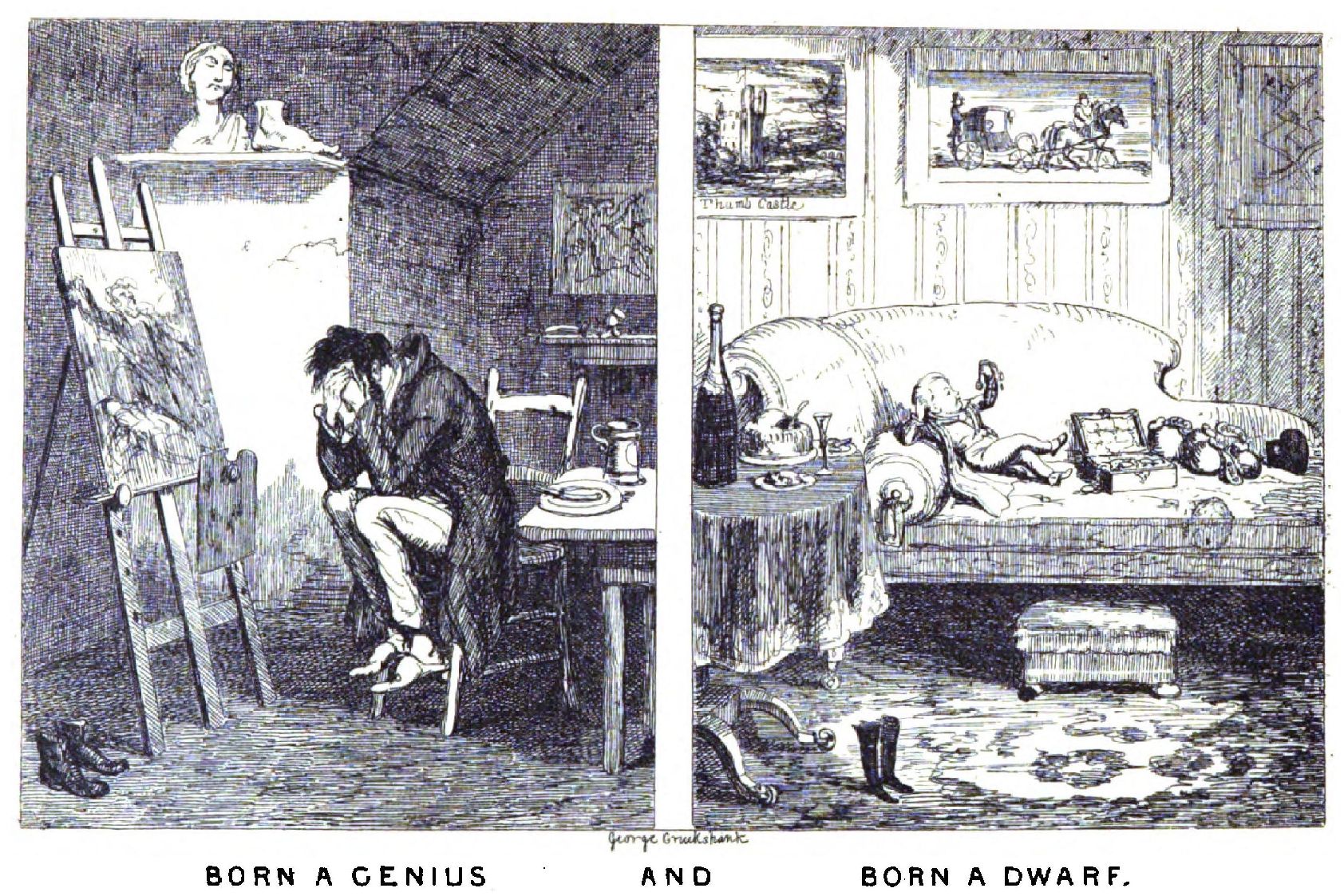 The arrival of Tom Thumb, and his reception by the élite of society, as the bills said, and the brilliant court he held under a shower of John Bull’s gold in Piccadilly, suggested two scenes to hard-working and most moderately-paid Cruikshank. The first is called “Born a Genius.” In a garret a poor artist sits in despair and poverty—his empty plate upon the table, his tattered boots upon the floor. The second is called “Born a Dwarf.”