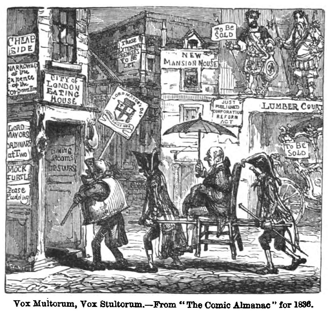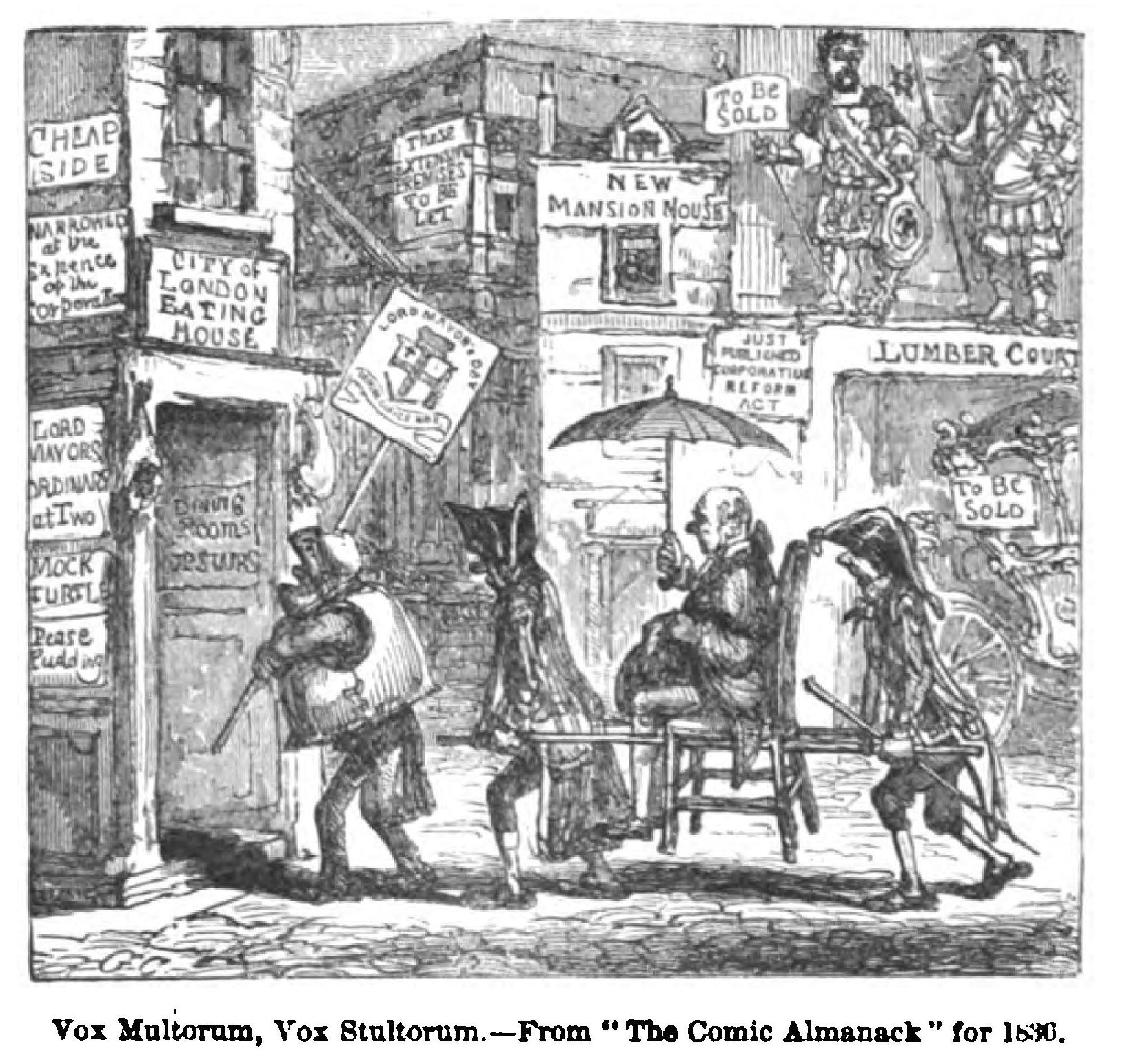 Guys in council over the gunpowder plot May now famishes the artist with one of his happiest bits of suburban scenery, “all a-growing,”—a housewife exchanging old garments for spring flowers; and now such a crowd of lean-shanked charity boys, with such a beadle as only the “inimitable George” could draw before Leech’s time, are beating the bounds. July furnishes a whimsical scene of the dog-days—with London dogs fighting, drawing carts, playing Toby in a Punch and Judy show, running under a truck, and an aristocratic dog looking haughtily down from a first-floor window. (Landseer took more than one hint from Cruikshank’s animals.) June “down at Beulah,” a December dance; May “settling for the Derby”—a wonderful assemblage of broad and long faces; July at the seaside, with cockneys donkey-riding—“long days and long ears;” a November fog; December—“a swallow at Christmas,” a procession of the many substantial items of Christmas cheer, making a procession into the prodigious maw of John Bull. The fountain of humour is inexhaustible. The satirical contrasts also, are capital. Premium, a smart gentleman, with the ladies smiling upon him; Discount, in the dumps, and shabby, with the ladies’ backs resolutely turned towards him. The Parlour and the Cellar, each getting drunk after its fashion. The “Shop and the Shay,” two delightful bits of London life. Then there is the British Museum in 2043, with a gibbet, the pillory, a stage coachman, a Whig, a Tory, and a tax-gatherer’s book among the curiosities.