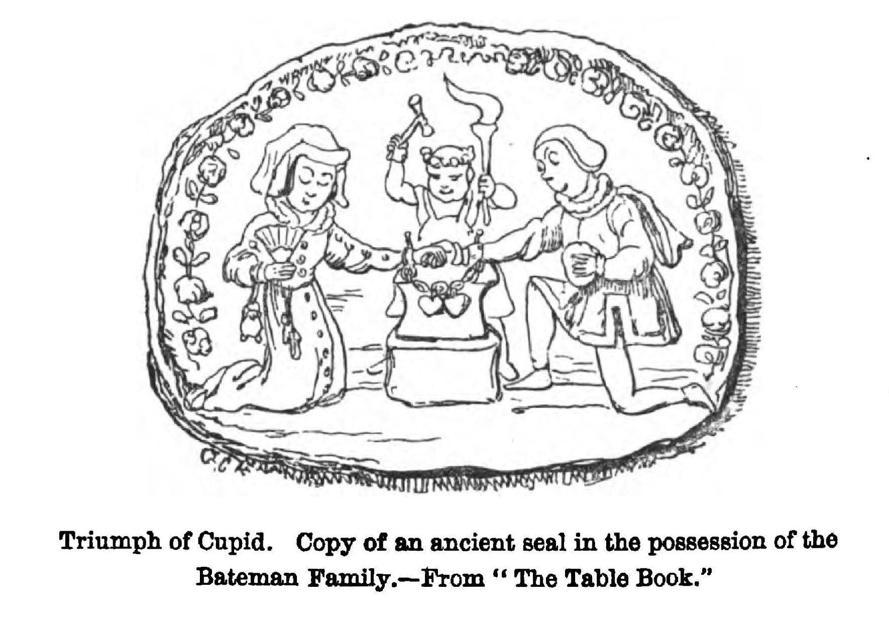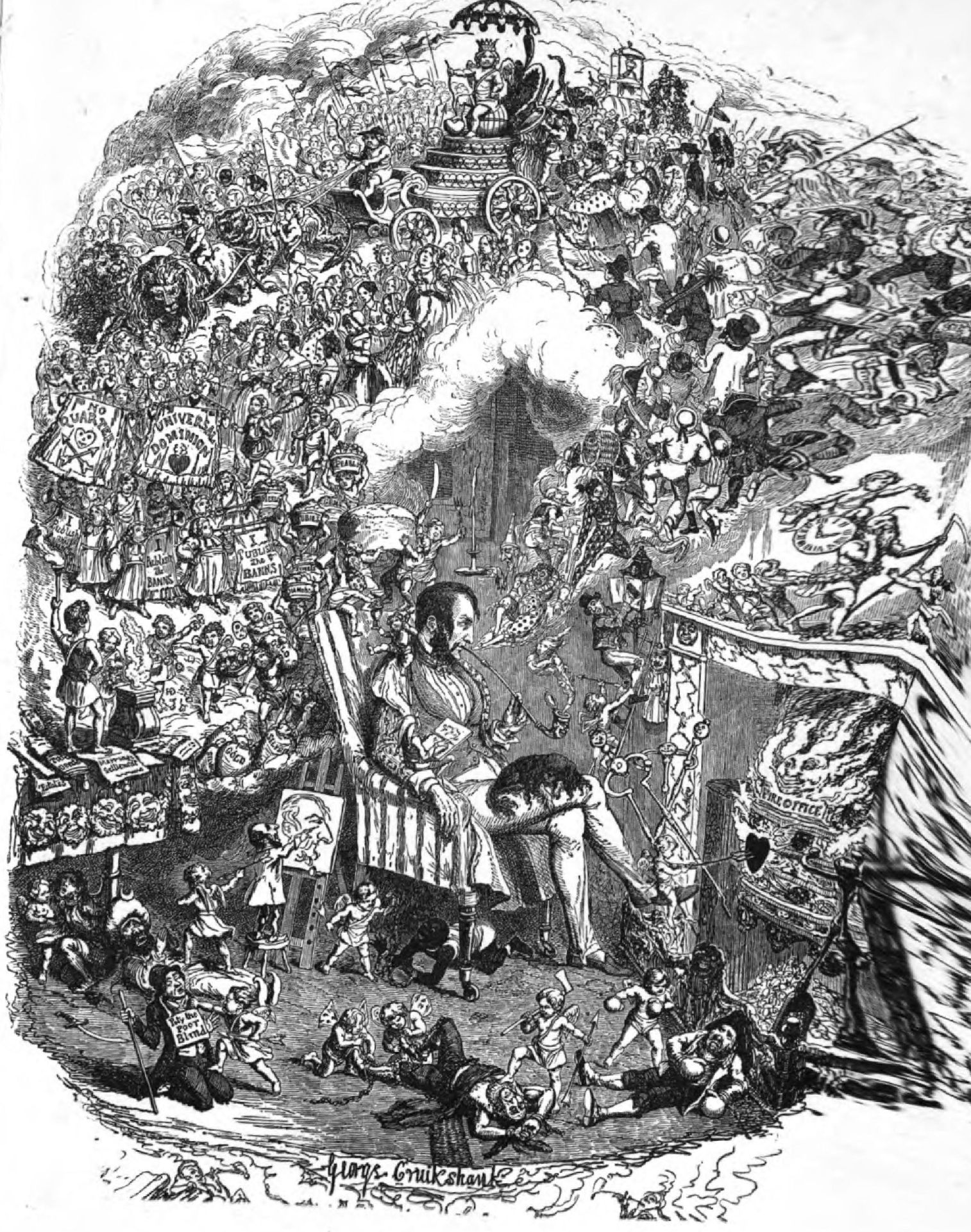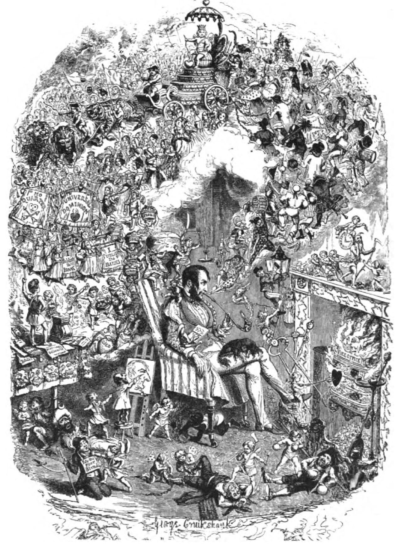 The “Table Book” includes two of Cruikshank’s most powerful and perfect etchings—viz., “The Triumph of Cupid” and “The Folly of Crime.” The fertility of imagination manifest in “The Triumph of Cupid” is amazing. The execution is that of an original master. No man who ever held an etching-needle has surpassed the truth and beauty and boldness of the touches by which hundreds of figures live, a happy tumultuous throng, in this octavo plate. The central figure is the artist, in slippers and embroidered dress-ing-gown, before his fire, smoking a handsome meerschaum pipe, gazing abstractedly into the fire; and upon the cloud of smoke from his lips, his dreams of the triumphs of Cupid rise till they fill the room.