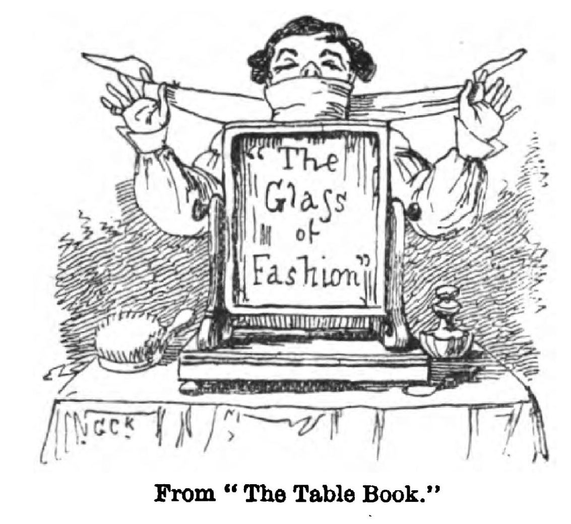 “Now, what does the reader imagine was this evil that had obtained such a hold upon the nation?—It was nothing more or less than the habit of ladies and gentlemen, and boys and girls, placing the handles of their sticks, canes, parasols, or umbrellas to their mouths, and either sucking them or tapping their teeth with them! Suiting the action to the word, and acting the characters, Cruikshank showed me how the gent of the period tried to make himself look excessively knowing by sucking the ivory or bone handle of his cane; how the young lady, and even the very little girl, made their morning calls, and sucked their parasol handles—a sure sign of great gaucherie; how other ladies, even elderly ones, who ought to know better, did the same in carriages and omnibuses, thereby running the risk of having their teeth broken if the vehicle gave a sudden lurch; and how even grave physicians carried their gold or ivoryheaded canes up to their lips. (I here reminded Mr. Cruikshank that if they did so it was in traditionary keeping with an old custom dating from the days of the Great Plague of London, when every doctor who carried ‘fate and physic in his eye’ had a cunningly devised box for aromatic scents fixed on the top of his cane, so that he might hold it under his nose whenever he visited an infectious case.)