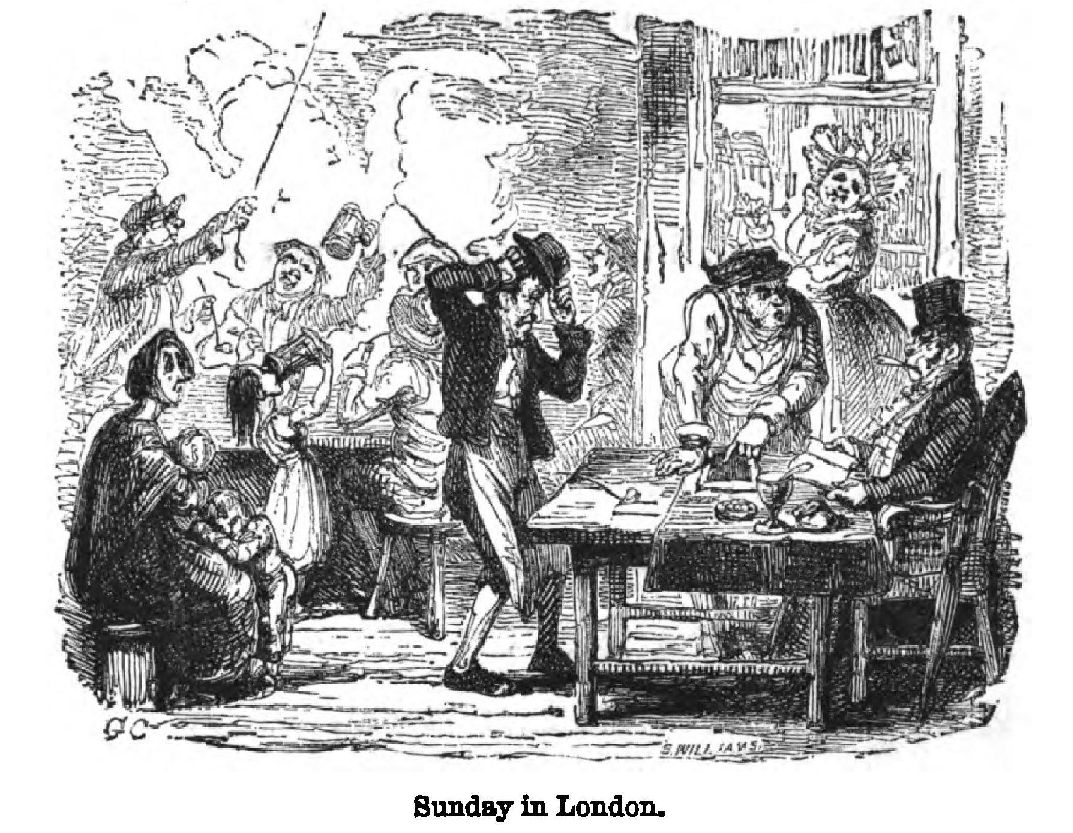 And so they walked about the streets for hours, strolling in the course of the day into the famous aviary of the Pantheon in Oxford Street.* Here Cruikshank came suddenly face to face with one of Mrs. Cruikshank’s intimate friends. The scene which ensued, Dickens used to say, was one exquisitely farcical. And the manner in which he set forth the episodes of the long day in the streets, with Cruikshank’s droppings into various hostelries, and his final dejected departure homewards, utterly worn out, and having exhausted his faithful friend, was in his happiest vein.